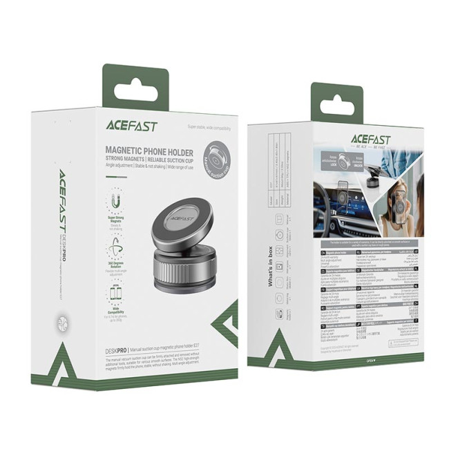ACEFAST E27 - це компактний автомобільний тримач з потужними магнітами та ручною присоскою, який дозволяє надійно фіксувати смартфон на різних поверхнях: центральний дисплей авто, лобове скло, гладкі столи, плитка на кухні чи у ванній. Завдяки регульованому обертанню присоски, монтаж та зняття телефону стає простим і швидким.
