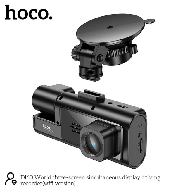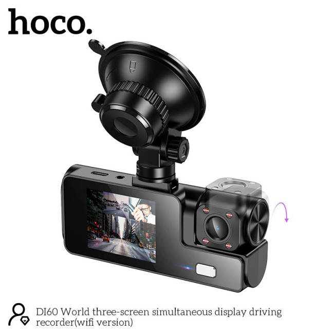 - Відеореєстратор HOCO DI60 World three-screen simultaneous display driving recorder (wifi version) |720p front/480p rear/480p inner|