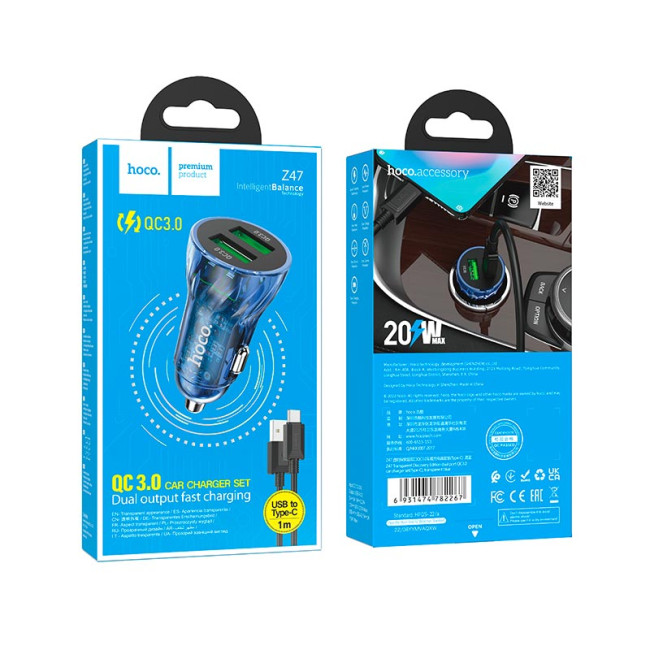 Адаптер автомобільний Hoco Type-C cable Transparent Discovery Edition dual port Z47 |2USB, QC, 3A|