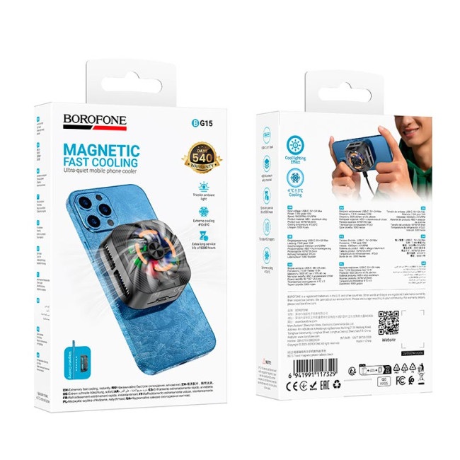 BOROFONE BG15 - це компактний магнітний кулер для смартфонів, створений для запобігання перегріванню під час ігор, зйомки відео або активного користування. Завдяки напівпровідниковій системі охолодження та безщітковому двигуну пристрій забезпечує стабільну роботу та мінімальний рівень шуму. Вбудована LED-підсвітка додає стильного акценту, підкреслюючи сучасний дизайн аксесуара.