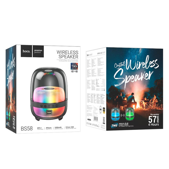 Акустика HOCO bs58-це не тільки потужний звук, але і стильний дизайн з прозорого скла, який надає елегантності та унікальності. Її кольорове підсвічування і можливість підключення через Bluetooth, TF карту або USB роблять її ідеальним аксесуаром для будь-якої вечірки або заходу.