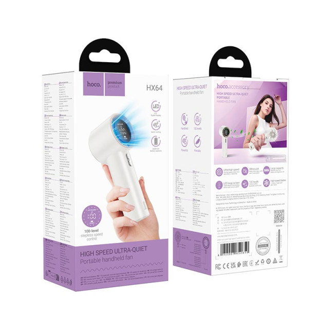 HOCO HX64 - це високошвидкісний ручний вентилятор із двигуном на 13 000 об/хв, який забезпечує потужний потік повітря навіть у найспекотніші дні. Оснащений цифровим дисплеєм та акумулятором на 3600mAh, він підтримує плавне регулювання швидкості на 100 рівнях для комфортного охолодження.