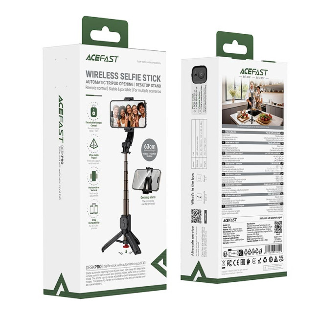 Acefast E43 — практичний аксесуар для фото та відеозйомки під час подорожей, прогулянок, стрімінгу або відеодзвінків. Завдяки автоматичному штативу та компактному дизайну монопод зручно використовувати в будь-яких умовах.