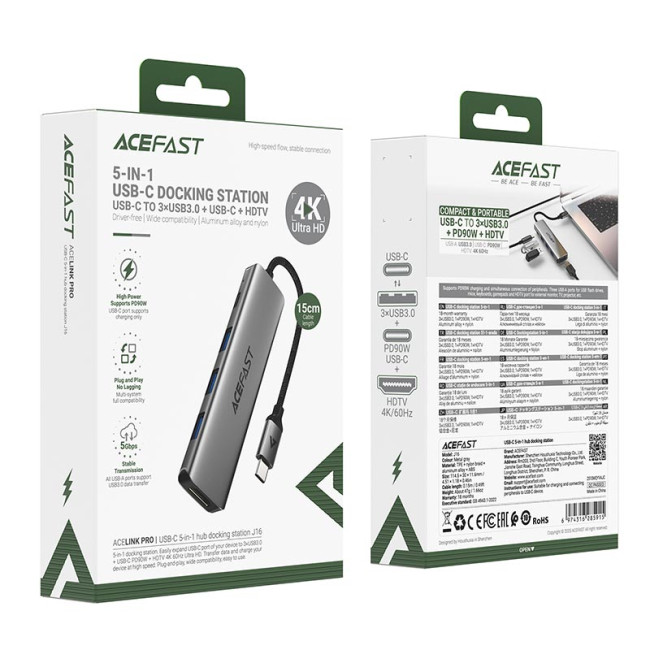 HUB адаптер ACEFAST USB-C 5-in-1 HUB docking station J16 |0.15m, 4K, PD90W, 5Gbps|