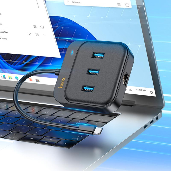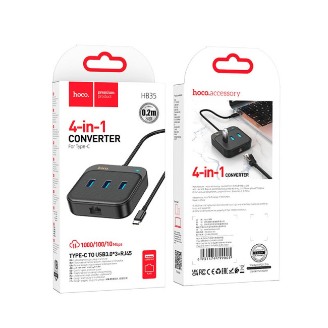 Hub адаптер Hoco Easy link 4-in-1 Gigabit Ethernet Adapter HB35 (Type-C to USB3.0x3+RJ45)(L=0.2 M)