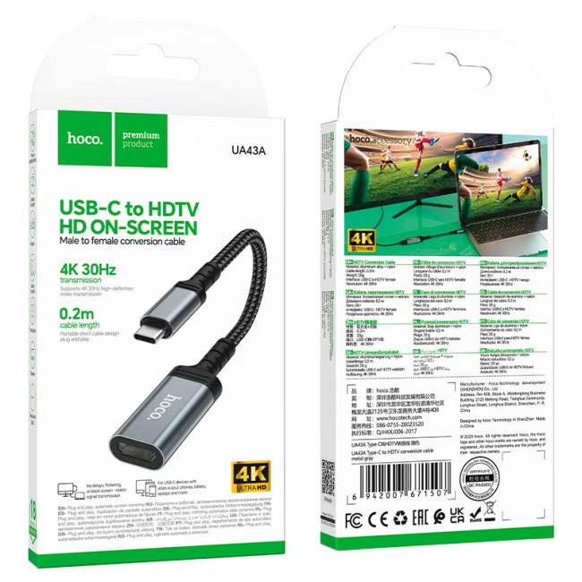 HOCO UA43A - це компактний кабель-перехідник, який дозволяє підключати пристрої з портом Type-C до HDTV-пристроїв, забезпечуючи відтворення відео у форматі 4K при 30Hz. Модель ідеально підходить для презентацій, перегляду відео або підключення ноутбуків і смартфонів до телевізорів та моніторів.