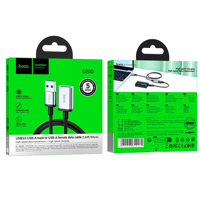 Кабель HOCO USB male to USB female USB3.0 excellent speed extension cable US10 |0.5m, 5Gbps, OTG|