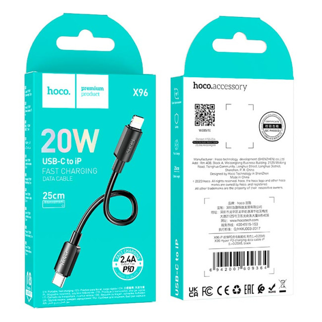 Кабель HOCO Lightning PD Hyper charging data cable X96 |0.25m, 2.4A/20W|
