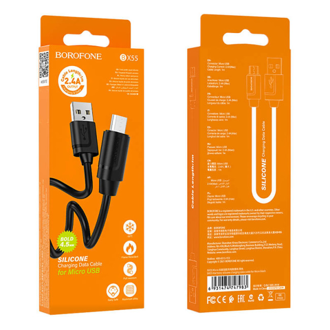 - Кабель BOROFONE Micro USB Harmony silicone charging data cable BX55 |1m, 2.4A|