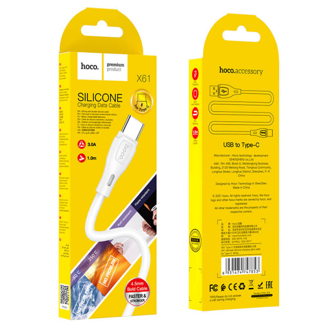 Надійність, еластичність та комфорт — усе це поєднано в Hoco X61 Ultimate. Завдяки потовщеному силіконовому покриттю кабель надзвичайно приємний на дотик і стійкий до перегинів, що гарантує довгий термін служби.