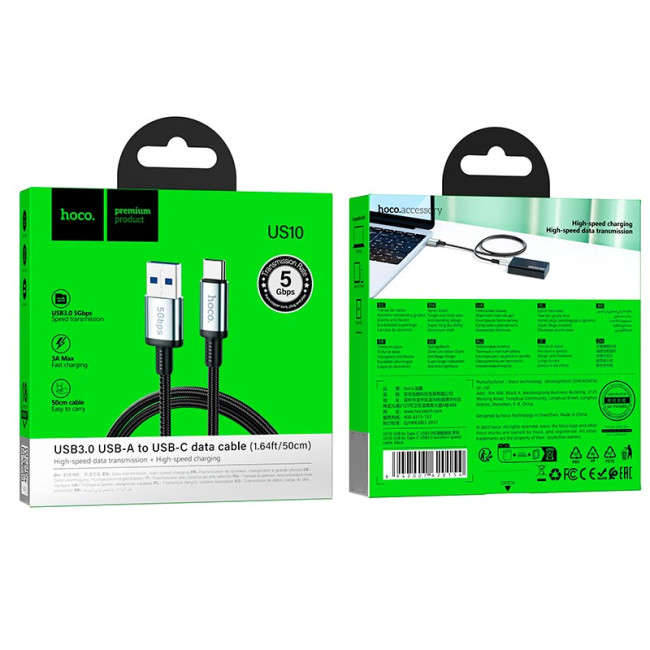 Кабель HOCO USB to Type-C USB 3.0 excellent speed cable US10 |0.5m, 3A, 5Gbps|