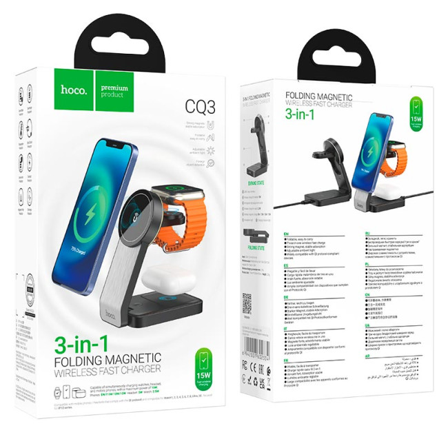 HOCO Qi Motorcycle folding 3-in-1 CQ3 являє собою бездротову зарядку, за допомогою якої можна заряджати до 3 пристроїв одночасно. Гаджет сумісний з безліччю смартфонів і TWS-навушників з підтримкою протоколу Qi, а також зі смарт-годинником Apple Watch. Є підтримка Mag Safe.