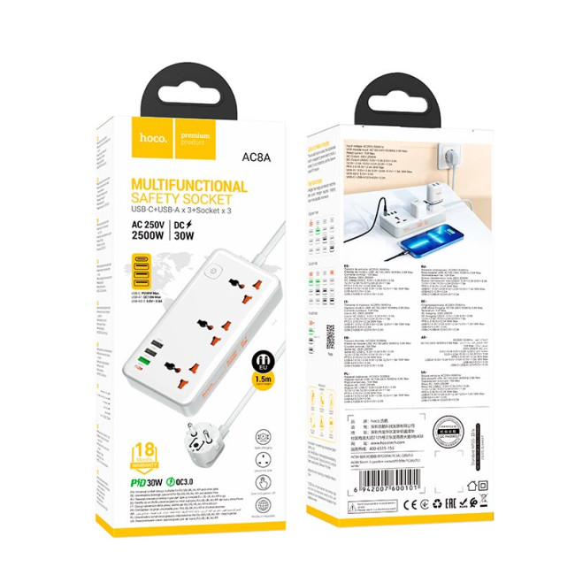 - Подовжувач мережевий HOCO Storm 3-position socket AC8A |3USB/1Type-C, PD/QC, 3A/30W|
