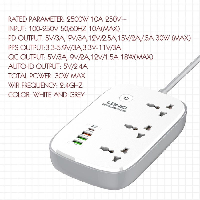 - Подовжувач мережевий LDNIO c Wi-Fi SCW3451 |3USB/1Type-C, 3Sockets. QC/PD, 30W/10A, 2m EU Plug|