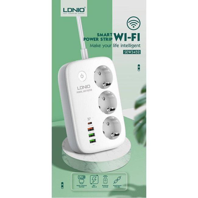Подовжувач мережевий LDNIO c Wi-Fi SEW3452 |3USB/1Type-C, 3Sockets. QC/PD, 30W/10A, 2m EU Plug|