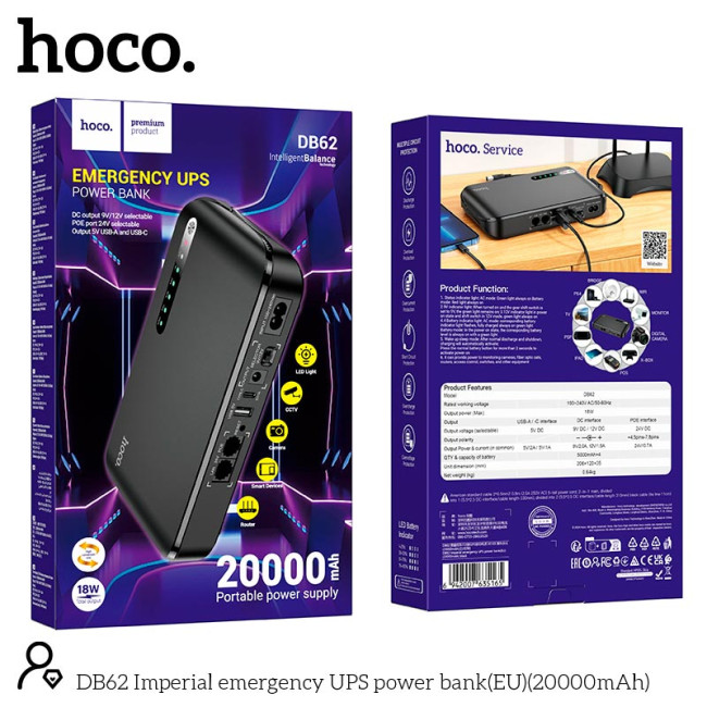 Mini DC UPS HOCO Imperial emergency power bank DB62 20000mAh |5/9/12v, USB/Type-C 18W, LAN, POE|