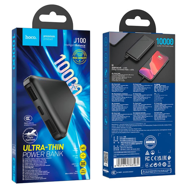 HOCO J100 — компактний портативний акумулятор ємністю 10000mAh, призначений для заряджання смартфонів, планшетів та інших мобільних пристроїв. Модель оснащена двома USB-портами для заряджання гаджетів та підтримує підключення через Type-C або Micro-USB для зарядки самого акумулятора.