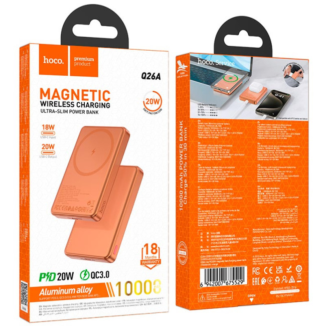 HOCO Q26A - це стильний магнітний повербанк з великою ємністю, підтримкою бездротової зарядки та технологій швидкої зарядки PD/QC. Магнітне кріплення дозволяє надійно фіксувати смартфон під час зарядки, забезпечуючи комфортне та швидке підживлення пристрою.