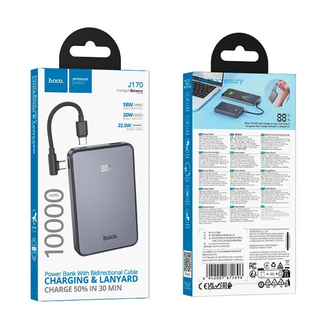 HOCO J170 - це портативний зовнішній акумулятор ємністю 10000mAh, який забезпечує стабільну та швидку зарядку смартфонів, планшетів та інших гаджетів. Модель підтримує сучасні протоколи PD, QC, FCP, SCP та AFC, що дозволяє оптимально підбирати напругу для будь-якого пристрою і забезпечує ефективну зарядку в будь-яких умовах.
