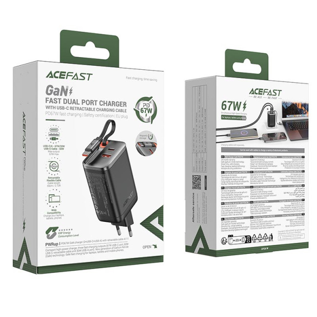 Адаптер мережевий ACEFAST PD GaN charger with retractable cable A111 |2×USB-C/1×USB-A, 67W/4.5A| - компактна і потужна зарядка