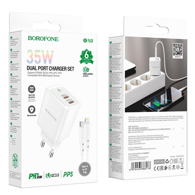 Адаптер мережевий BOROFONE Type-C to Lightning cable Reacher dual port charger set BN9 |2Type-C, 35W/3A, PD/QC|