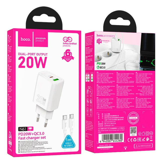 - Адаптер мережевий HOCO gentle charger N61 (Type-C to Type-C set) |1USB/1Type-C, 20W/3A, PD/QC|
