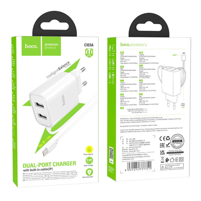 Адаптер мережевий Hoco C103A — це надійний і ефективний зарядний пристрій для ваших гаджетів з двома USB-портами і вбудованим кабелем Lightning. Ідеальний вибір для тих, хто цінує швидкість і зручність під час зарядки.