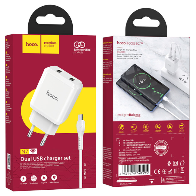 Адаптер мережевий HOCO Micro USB cable Speedy dual port charger set N7 |2USB, 2.1A| (Safety Certified)