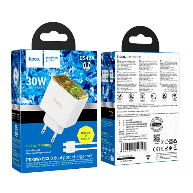 Адаптер мережевий HOCO Smart charger Type-C to Lightning cable set CS42A |1Type-C/1USB, 30W/3A, PD/QC|