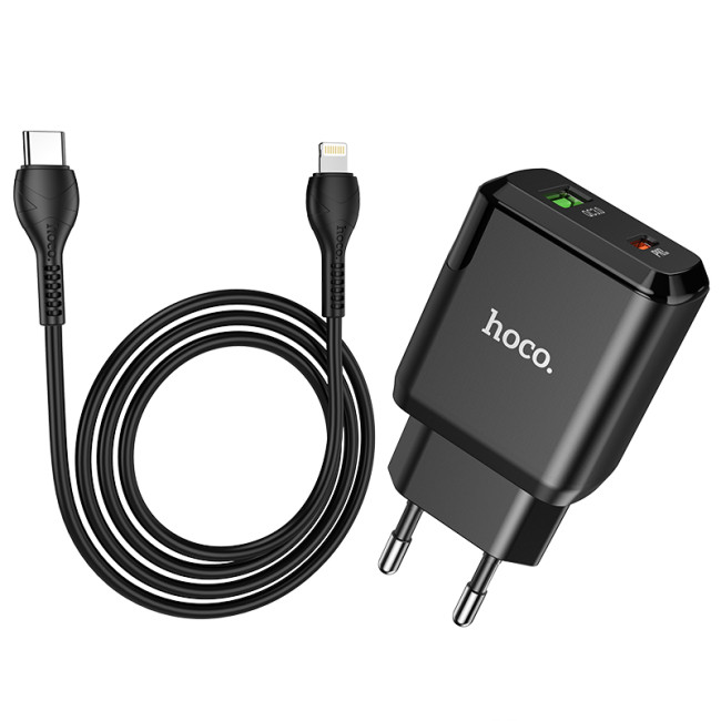 Адаптер мережевий Hoco Type-C to Lightning Cable Favor dual port N5 |1USB/1Type-C, PD20W/QC3.0, 3A| (Safety Certified)
