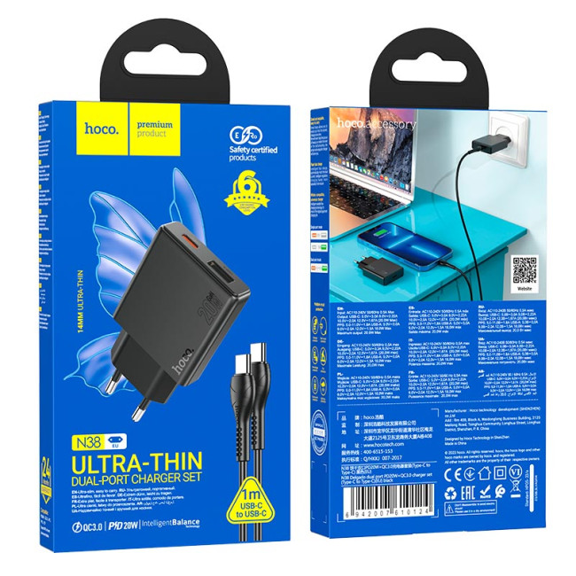 Адаптер мережевий HOCO Type-C to Type-C Delgado dual port charger N38 |1USB/1Type-C, 20W/3A, PD/QC|