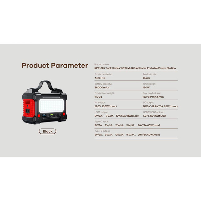 Портативна електростанція REMAX Tank Series 150W Power Station RPP-325 36000mAh |3USB/Type-C/DC/AC|